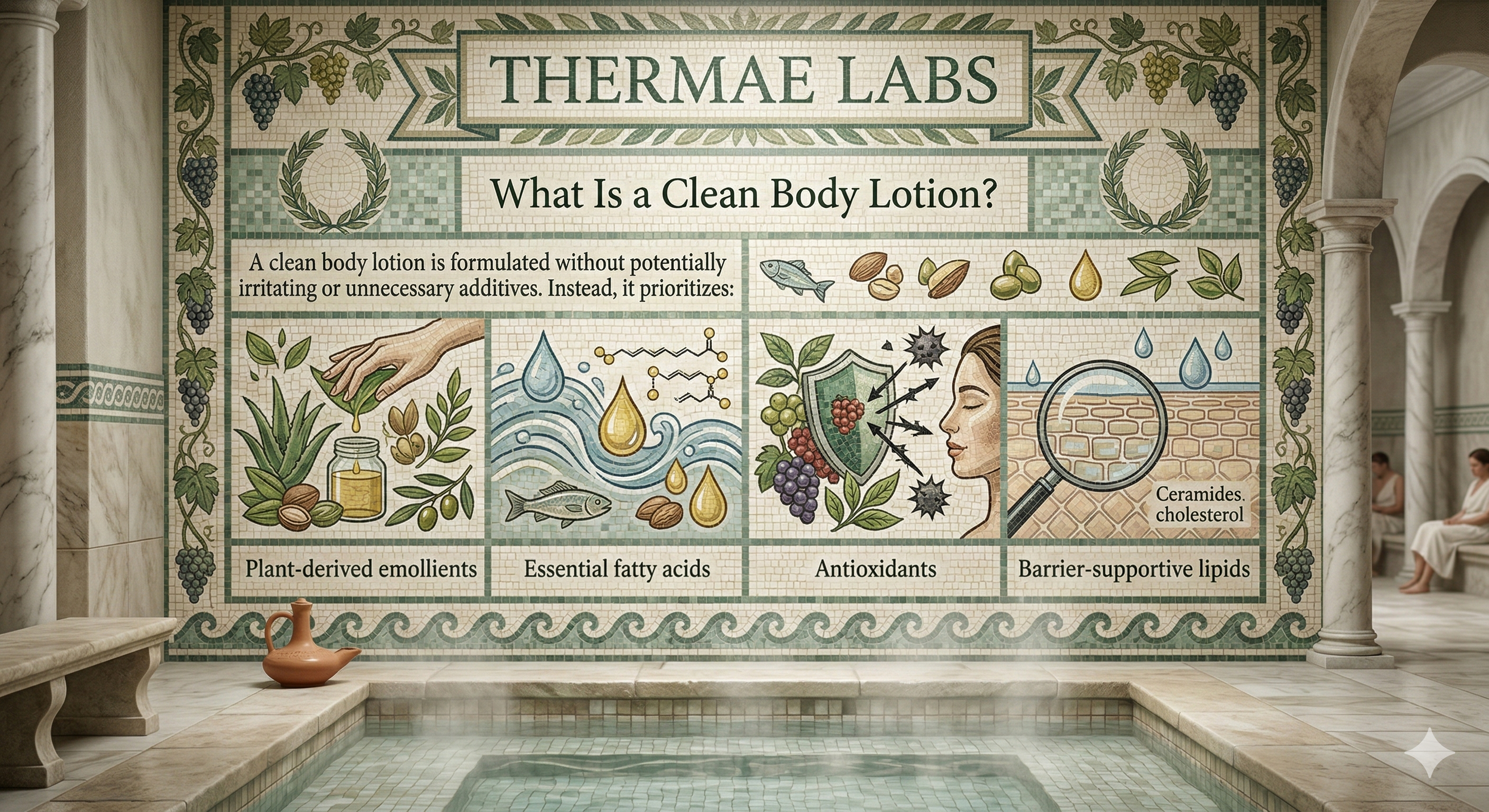A clean body lotion uses skin-compatible ingredients like shea butter, aloe vera, and olive oil to hydrate and support the skin barrier without synthetic fragrance, petroleum-based fillers, or harsh preservatives.